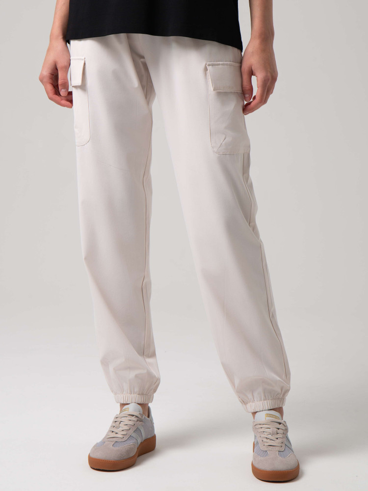 Характеристики: Брюки-карго из легкой ткани на основе полиэстера. Комфортный эластичный пояс с внутренним шнурком обеспечивает оптимальную посадку на талии. Накладные карманы с клапаном по бокам служат декоративным и функциональным элементом в этой модели.